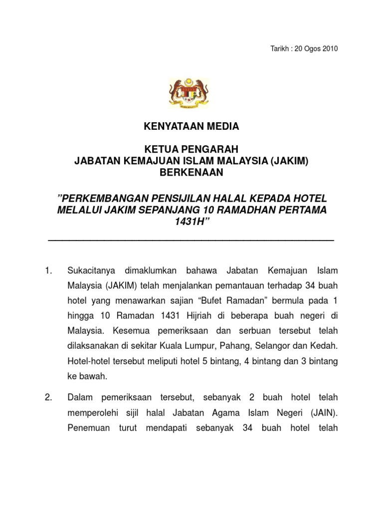 Kenyataan Media Ketua Pengarah Jabatan Kemajuan Islam Malaysia