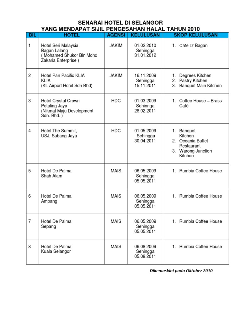 Senarai Hotel Yang Memiliki Sijil Bahagian Hab Halal Jakim
